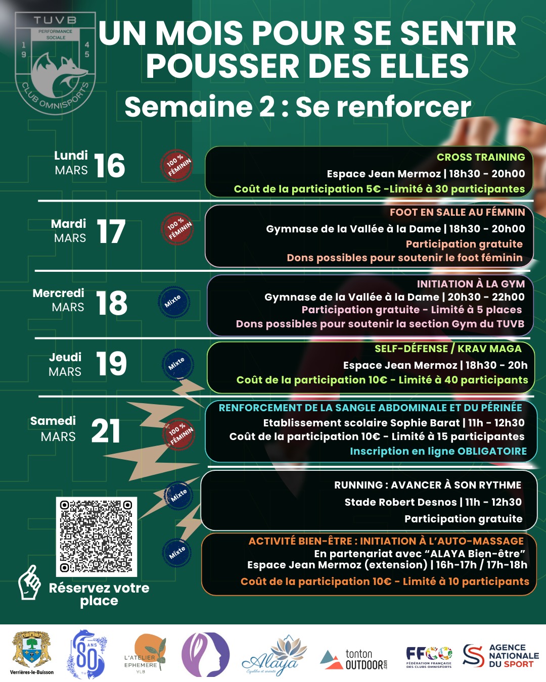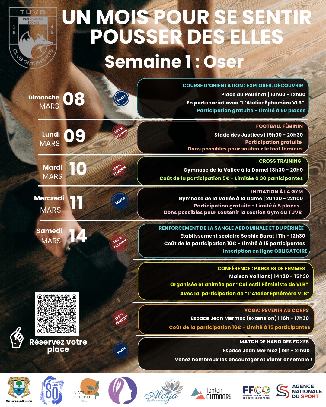 Organisée avec le Collectif Féministe de VLB et L’Atelier Éphémère VLB, cette conférence accueillera notamment notre coprésidente (Marie-Pia Lavergne) et la Présidente de la Fédération Française des Clubs Omnisports, venues témoigner de la place des femmes dans les institutions sportives.